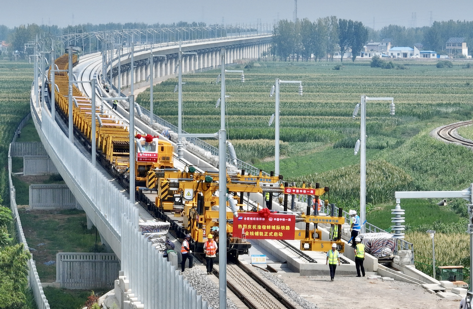 当日,在淮宿蚌城际铁路铺轨施工现场,中铁一局施工人员将首对500米长钢轨铺设在无砟轨道上,这标志着淮宿蚌城际铁路全线开始铺轨。