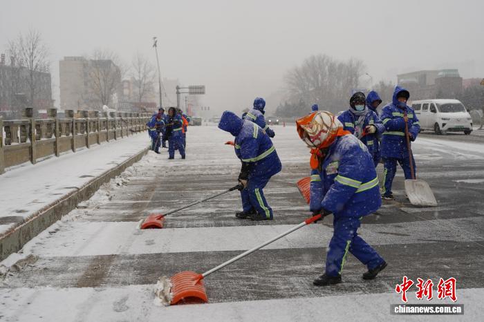 1月19日,河南郑州环卫工人清扫积雪。赵梦阳摄