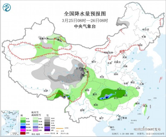 3月25日08时至26日08时,新疆东部、西藏东部和北部、青海大部、甘肃中南部、川西高原北部等地部分地区有小到中雪或雨夹雪,其中,青海东部和南部、甘肃南部等地部分地区有大到暴雪。西藏东南部、贵州东北部、重庆东部、湖南中北部、湖北南部、江西西北部等地部分地区有中到大雨,其中,湖南西北部、贵州东北部等地局地有暴雨(50~80毫米)。内蒙古中部、新疆南疆盆地等地部分地区有4~6级风,其中,新疆东部部分地区有7~8级风。