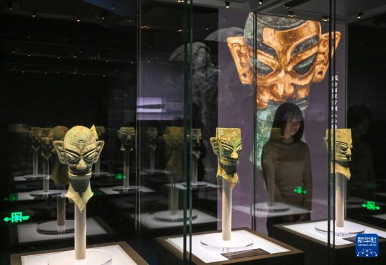 这是展出的戴金面罩青铜人头像(1月18日摄)。