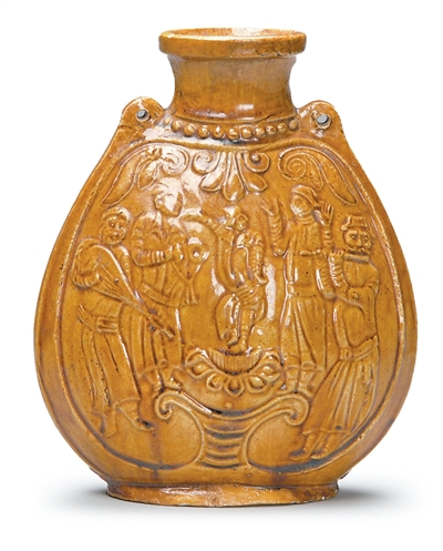 河南博物院藏黄釉扁壶是一件北齐时期的铅釉陶器,1971年在河南省安阳范粹墓出土。墓主人范粹为北齐骠骑大将军、开府仪同三司、凉州刺史。壶体通高约20厘米、宽16.5厘米、口径5.1厘米,呈扁圆杏核状,上窄下宽,敞口短颈,两肩各有一穿孔。通体施黄釉,釉色莹润,类似金银锤制的凸凹效果。
