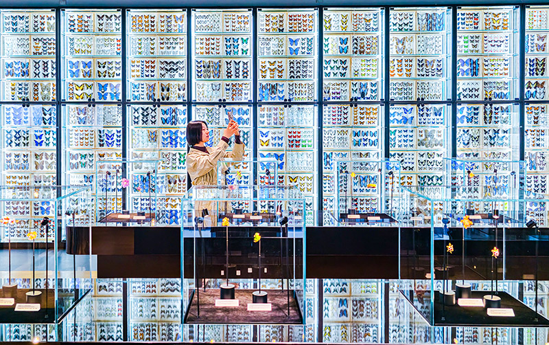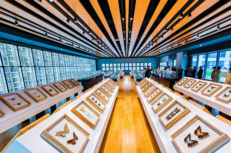 场馆内除了有支撑自然科普传播的基础展陈内容,为公众普及昆虫学知识、传播自然生态理念,还打造了视觉识别度高的蝴蝶墙、古董珠宝尾厅等特色展区。在“珠宝尾厅”,昆虫标本与古董珠宝并置展示,一只镶嵌宝石的甲虫胸针旁,静静躺着同款甲虫标本——科学与艺术在此碰撞,形成一场“自然原型”与“人类回应”的跨时空对话。