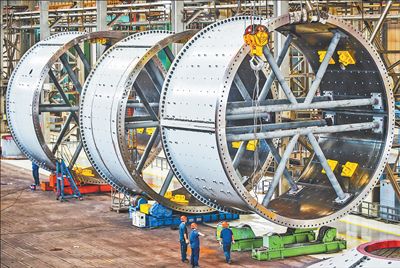 8月26日,位于河南省洛阳市的中信重工总装车间内,工人在起吊出口海外的超大规格矿业装备磨机筒体产品。
